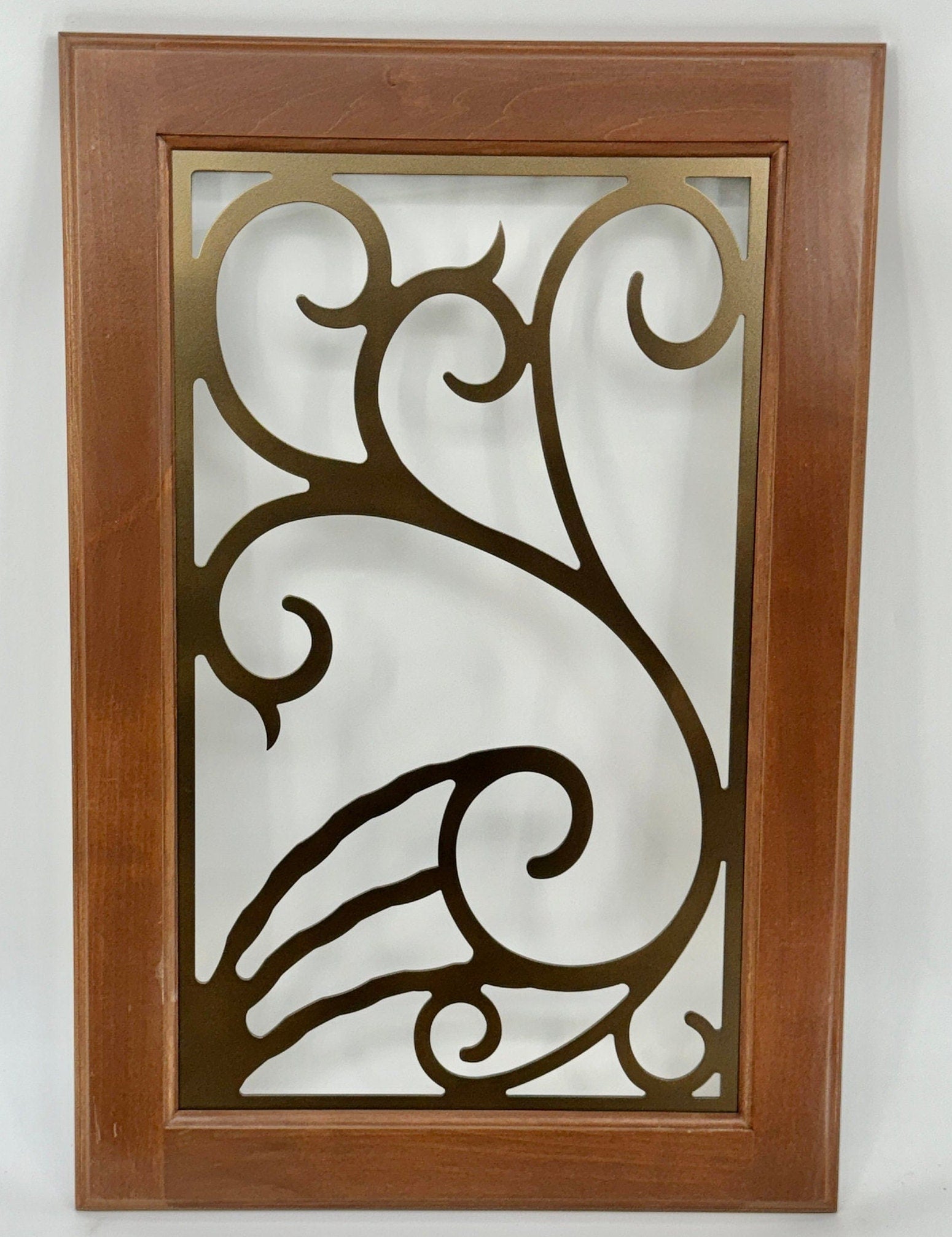 Listing is for a metal insert your custom size x .134” thick. Choose any design in any width & height in per sq inch pricing. You can order a mini insert sample (6”w X 10”h X .134” thick) of any design which allows for a sample of any design at low cost. Stained glass look, called colorcast also an available option on all designs. Six standard colors-See product photo with finishes. Attachment/hanging holes available at no added cost. Made in Grantville, Ga, our products can be utilized for cabinetry doors and/or cabinetry end panels and/or cabinetry backs, house doors, garage doors, garden gates, furniture doors, wall art, fence panels, wine storage, balcony/stair railing panels, windows, art niches, decorative accents, pass-throughs, screen doors, transoms, and wall art.